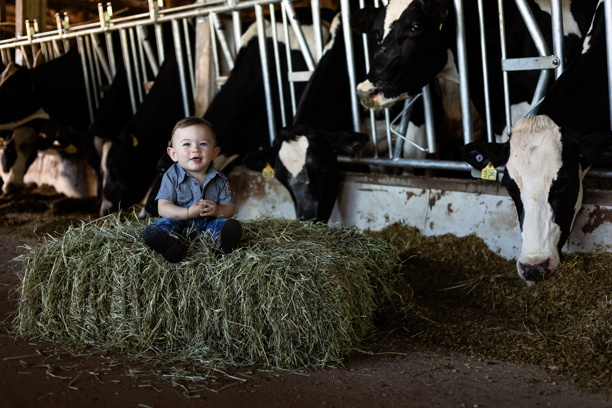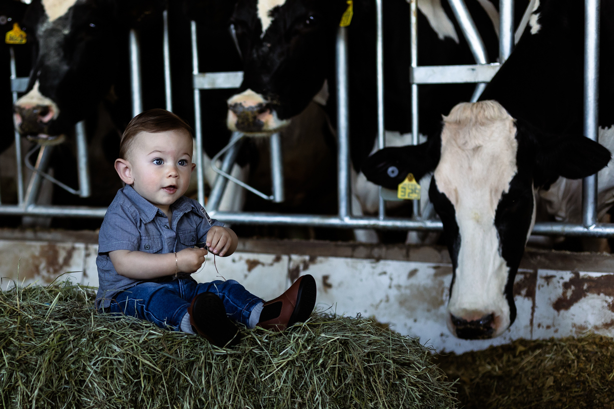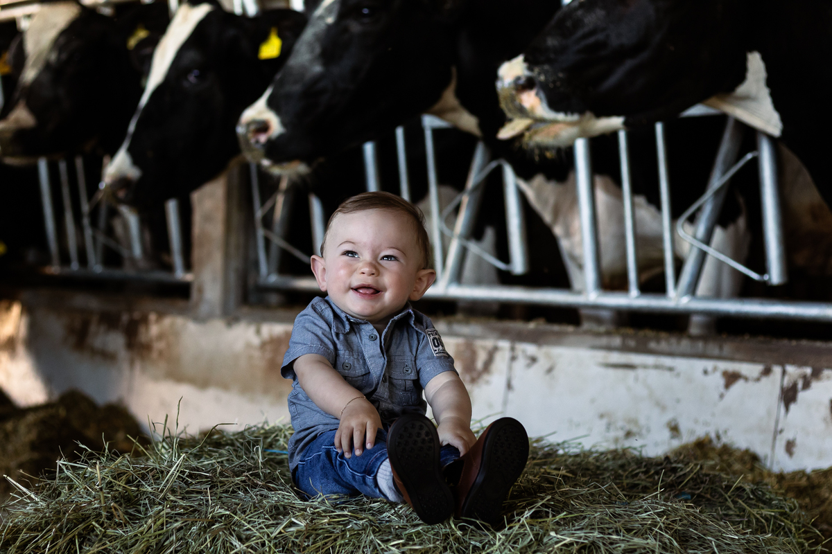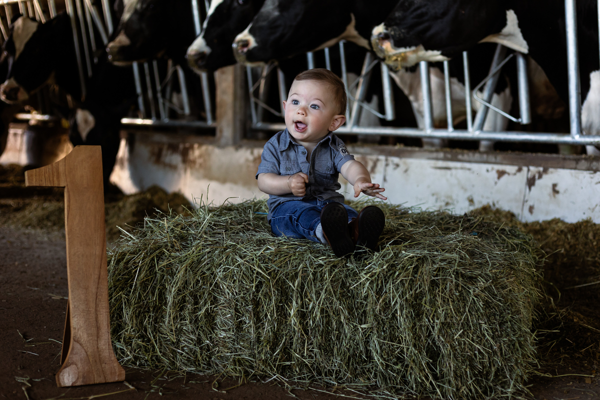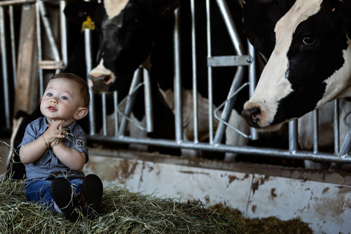 Quando cheguei na casa do Arthur, ele ainda estava acordando e a mamãe Lenara o ajudava a se vestir. No começo ele chorou um pouquinho, mas bastou sentar no feno, ao lado das vacas, para o sorriso aparecer — ele simplesmente amou! 😊