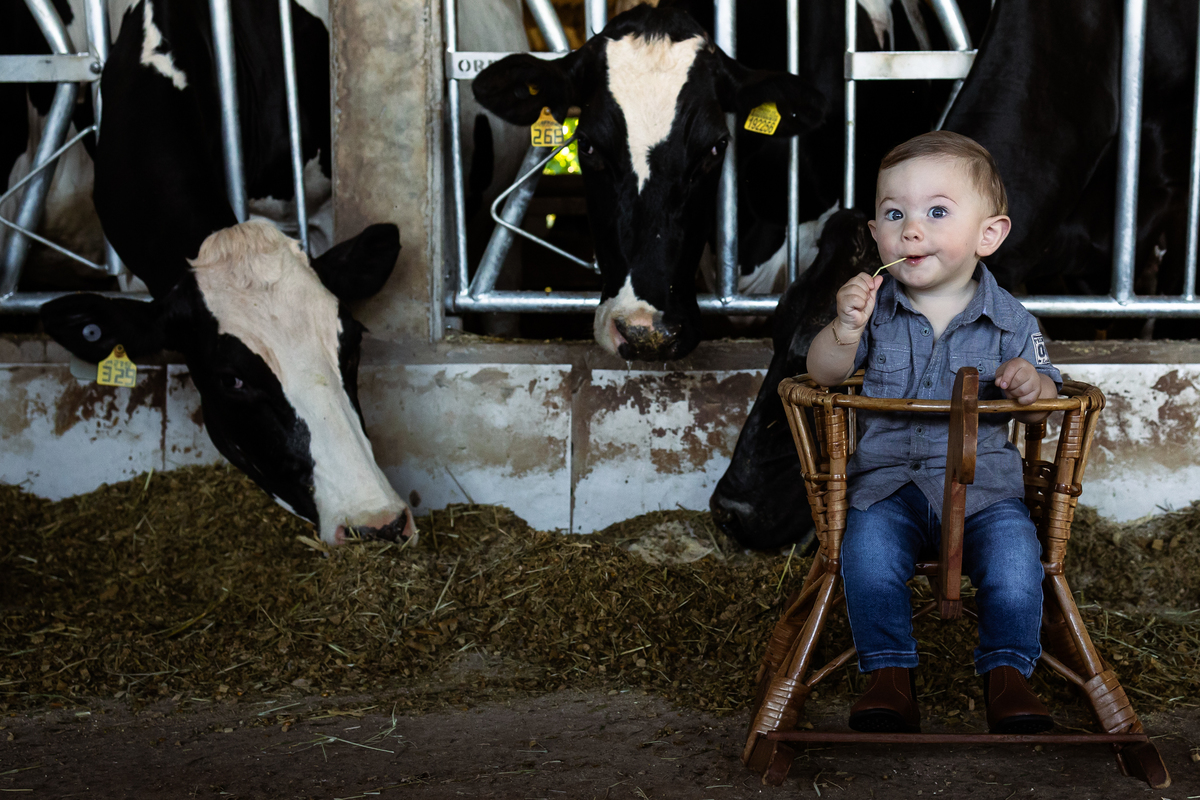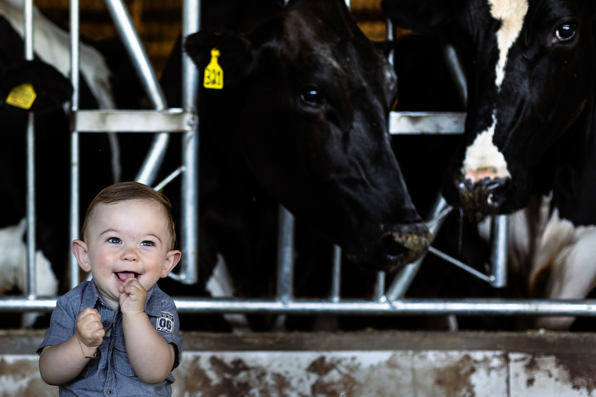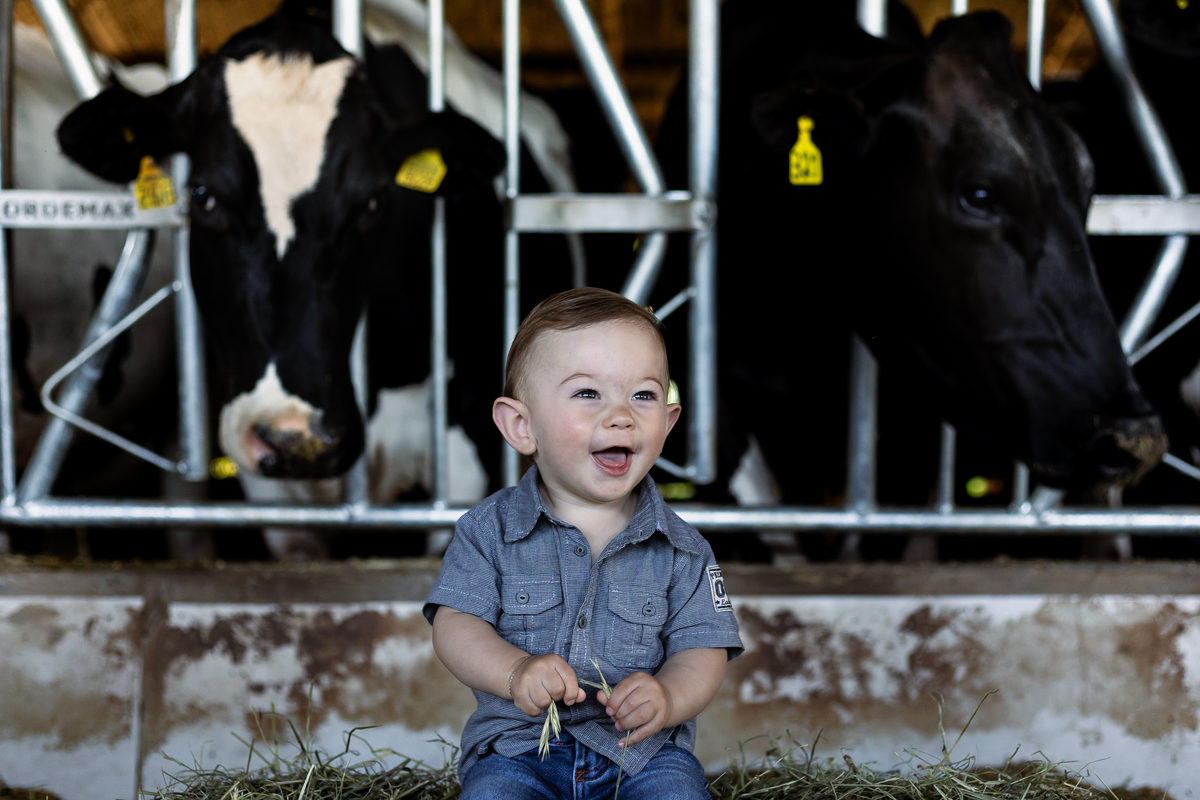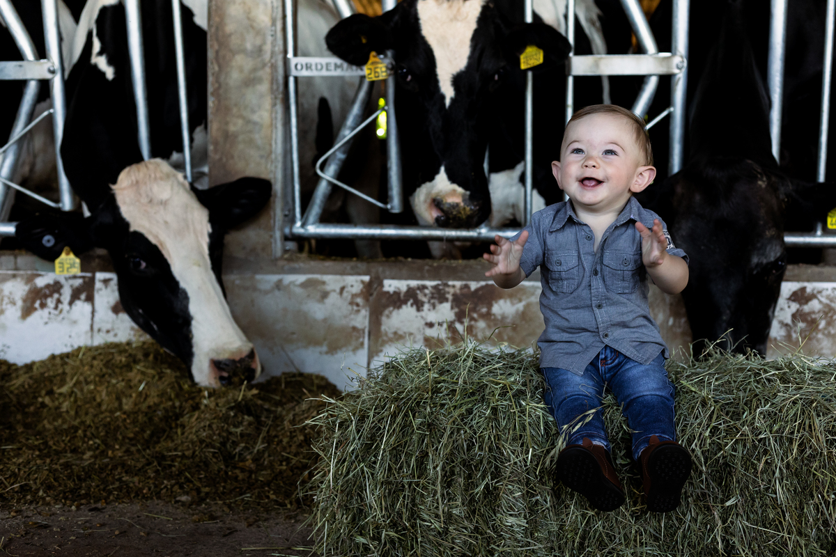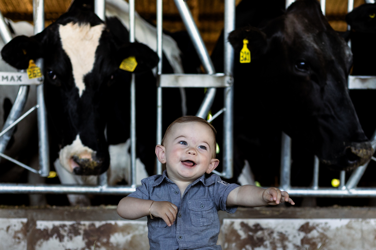 Quando cheguei na casa do Arthur, ele ainda estava acordando e a mamãe Lenara o ajudava a se vestir. No começo ele chorou um pouquinho, mas bastou sentar no feno, ao lado das vacas, para o sorriso aparecer — ele simplesmente amou! 😊